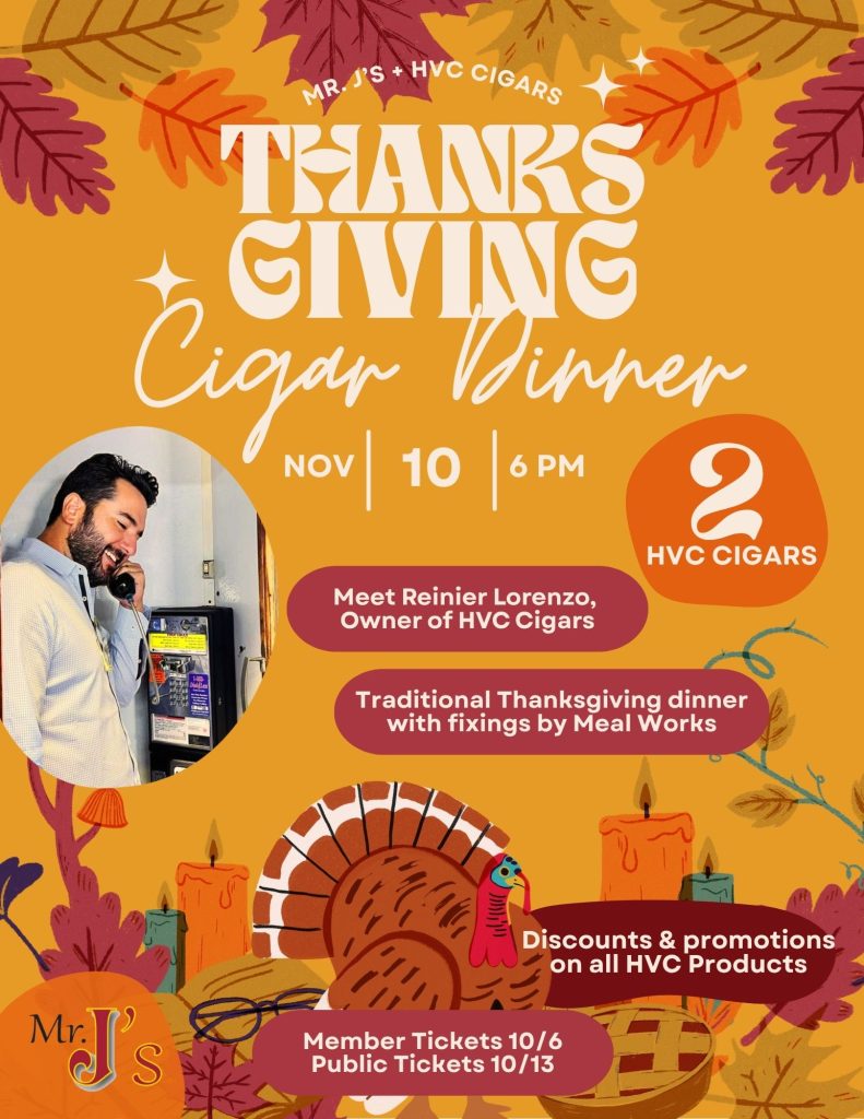 $60Join us November 10 at 6PM for the annual Thanksgiving Dinner. Reinier Lorenzo, the owner of HVC Cigars will be with us alongside regional HVC Rep Nick Goss! If you’ve been a customer for any length of time, you know that we stand behind HVC and even have a Mr J’s exclusive cigar with them. Come enjoy some fantastic food by Meal Works and have a great time!