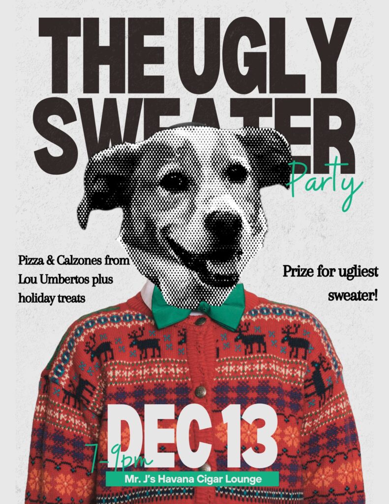 December 13, let’s see all those fabulously ugly sweaters! We’ll have Pizza & Calzones from Lou Umberto’s and holiday treats and a prize for the ugliest sweater.